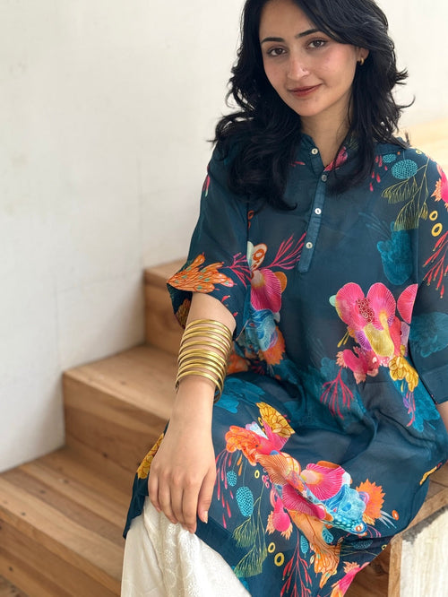 Green and Blue Hand Block Tiger Print Cotton Kurta Set